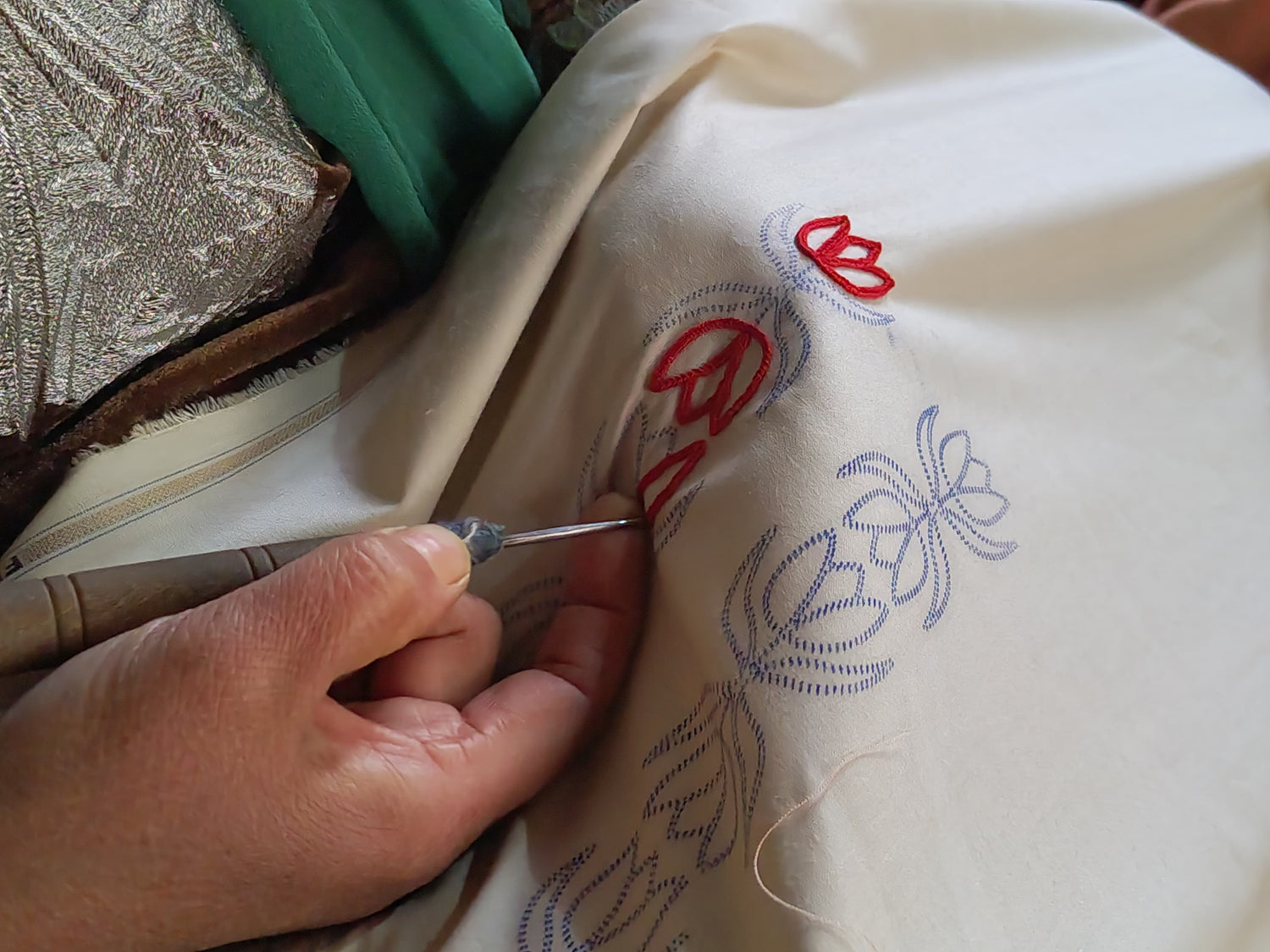 The artisans' hands grasp the aari needle day in and day out, ensuring the intricate detailing of every thread woven into the fabric.