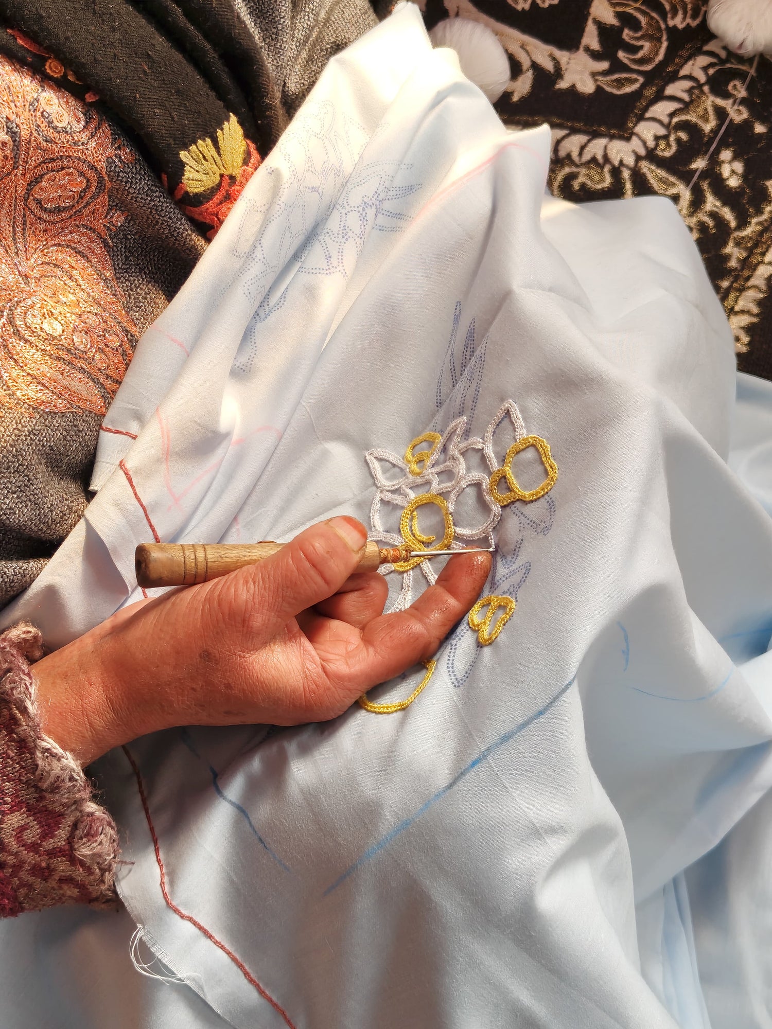 The artisans behind this wearable work of art are second to none, serving as living testaments of their ancestors' craftsmanship. Among them was Aisha Mirza, who has been trained by her grandmother since childhood. Her graceful skills move with precision into each stitch.