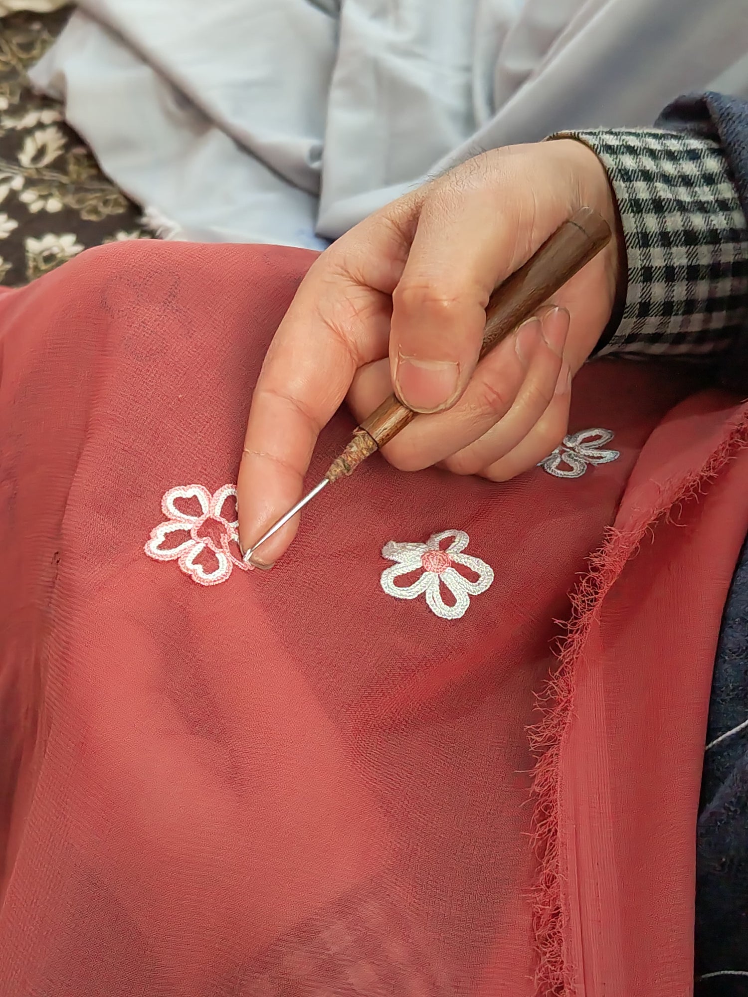 The artisans' hands grasp the aari needle day in and day out, ensuring the intricate detailing of every thread woven into the fabric.