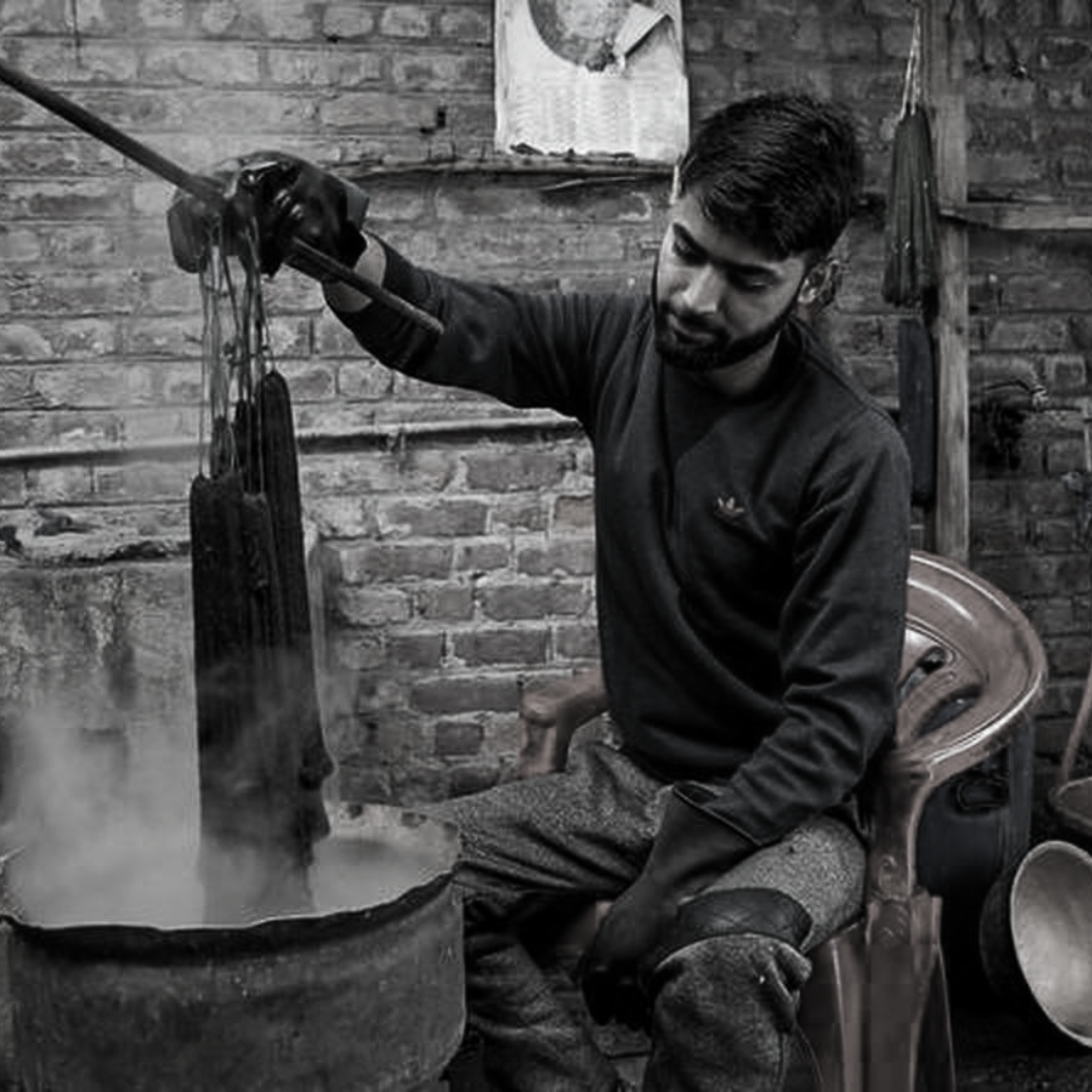 The yarn is wound onto a small flange bobbin using a Parota. The weaver applies Saresh adhesive to the yarn in hank form, enhancing its durability and weavability. Finally, the yarn is mounted onto a handloom, where craftsmen known locally as 'Wovur' transform it into various luxurious wraps.